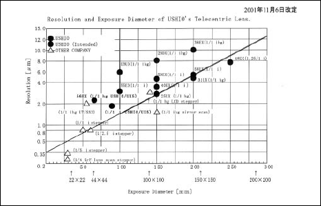 次にこのレンズの開発をどのように進めてきたのかについてお話しいたします。露光装置といわれるものの中で投影露光方式を取る装置としては半導体のステッパが最も代表的で有名です。図6はウシオ電機の開発したレンズの性能マップで、縦軸が解像度、横軸がフィールドサイズです。電子部品業界に貢献するためにはどのような投影レンズが必要かを考えたとき、なるべく有効口径が大きく、解像力を要求されない領域を狙っていこうということになりました。このことは半導体ステッパや液晶ステッパとは明かに異なり、これが我々の特徴でもあり最初にあった開発コンセプトです。当時(10数年前)はプロキシミティ露光機が全盛時代でした。このような状況でウシオが最初に開発したのはTABテープ用の露光装置でした。有効口径が約Φ100mm、解像力が10~12µm Line/Space程度でした。それ以降は通常のハイエンド領域に向けての開発は行わず、もう少し違った領域で開発を継続することになりました。このあたりの開発の歴史的な経緯は弊社発行のライトエッジという技術情報誌の23号において特集記事になっていますので興味のあるかたは請求してください。(システム事業部営業部:TEL045-901-2572)