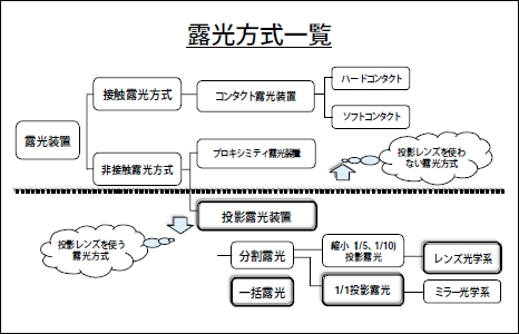 次に投影露光方式は、露光方式全体から見た場合、どのような位置づけなのかということについてお話しします。全体の露光方式は大きく分けて接触露光と非接触露光かに分かれます。接触露光はマスクとワークを物理的に接触させ、影絵のようにして露光するタイプで、接触の度合いによってハードコンタクト露光、ソフトコンタクト露光などと呼ぶことがあります。一方、接触式でない場合、一つはプロキシミティ露光というものがあります。ワークとマスクの間を通常であれば数10µm、多いもので100µm前後離して露光するタイプのものです。もう一つが投影露光という投影光学系を使った露光です。投影露光も、分割露光といわれている、いわゆるステッパーと、一括露光の二つに分類できます。