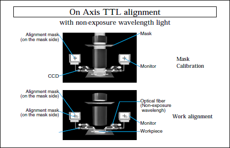 マスクがあって、そこに露光光を当てて、まずアライメント用のカメラのキャリブレーションをしてしまいます。通常、露光光を当てますから、この時にワークが下にあっては露光されてしまいます。そこで、ワークが無い状態で行います。マスクとカメラのキャリブレーションが終わった状態で、上からの光を止めて、そのままの状態でワークを搬入します。そして、今度は非露光波長の光をワーク照明光として導入して、先程キャリブレーションしたマークに対してワークを動かしてアライメントします。この基本的なロジックでアライメントすることによってマスクとワークの相対的な位置をかなり精度良く露光することができます。これが弊社がOn AxisTTL alignmentと呼んでいるアライメント方法です。この動作をステップごとにn回のショットで繰り返し、全面を露光していくというのがアライメントのステップの代表的な例です。