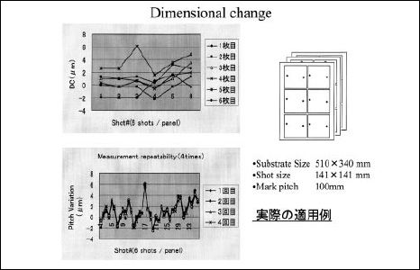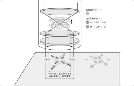 もう一つの例として、オートスケールというものがあります。プリント板等の電子部品用材料の代表的なものは、材料自体が非均一な伸縮をしてしまう問題があります。それをクリアするためにウシオでは、実際のワークの伸縮率にあわせて、1ショット、1ショット投影倍率を調整するという機能を設けています。実際の基板のシュリンクを測りますから、毎回どの程度伸縮しているか、それに合わせるためにどの位を動かすかということを常に計測して、フィードバックをかけるという動作をしています。このような要求に対応するためにオートスケールと呼ばれる機能を装備しています。