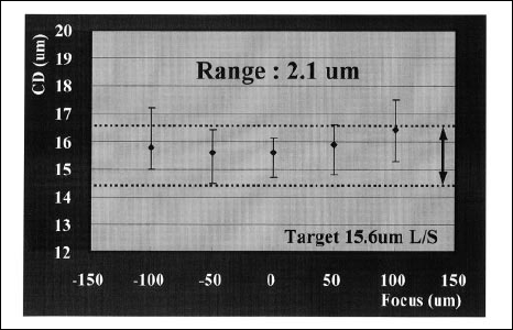 CDとはCritical Dimensionと呼ばれている線幅の安定性です。図15は15.6µmL/Sの設計値に対して、実際の線幅のばらつきがどの位あるか、かつDOFというピントの位置をわざと50µmずらした時の変化を測定したものです。これは何を意味しているかというと、基板が反ってうねる場合に、あるところは50µmくらい上になり、あるところでは50µmくらい下になるというケースが想定されます。従ってジャスピンだけでなく、わざとピントをずらした位置でのCD、つまり面の線幅のばらつきをデータとして取ったものです。図15ではレンジで50µmのDOFでレンジ2.1µmなので15.6µmL/Sに対して±1µm程度で仕上がっています。最近の厳しい要求では、20µmL/Sで5%くらいまでに入れてくれということもあります。