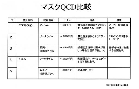 装置のイニシャルコストは当然半導体用ステッパが一番高く、数億~10億近いものまであるのではないかと聞いています。それに比べて、コンタクト、プロキシミティというのは非常に安く、ミラー、レンズプロジェクションというのは中間くらいのポジションです。決定的に違うのは、非接触タイプのものはマスクの寿命が半永久的であるということです。コンタクトタイプの場合にはどうしても汚れ、欠損の問題を発生させてしまいます。