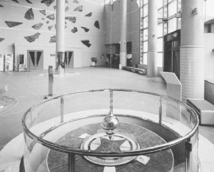 3階の天井から吊り下げられた振り子は、ワイヤーの長さが15.6m、真鍮の重りの重さが107kgあり、振り子の回転にしたがって、床面のピンが倒れるように設計展示されています。地球の自転を感じながらピンの倒れる様子を眺めていると、暫し時の経つのを忘れてしまいます。姫路科学館では1日に約206度回転するそうです。また、エントランスホール内には、ジルコニウムの輝きでビッグバンを表した壁画のレリーフなど、様々な興味深い展示物もあります。