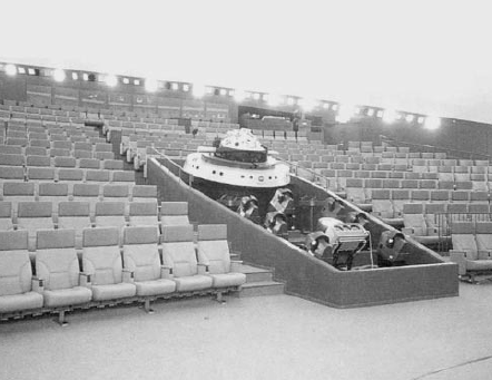 会場は大きく分けて、中央にある投影機本体、後ろ側にある操作卓(コンソール)と半球形のドームスクリーンの3つで構成されています。