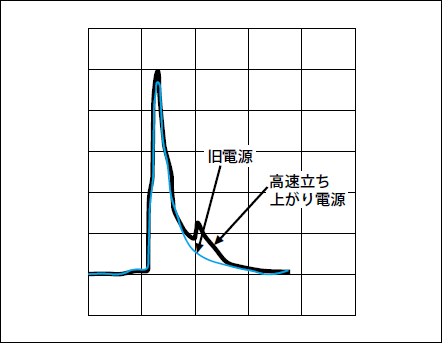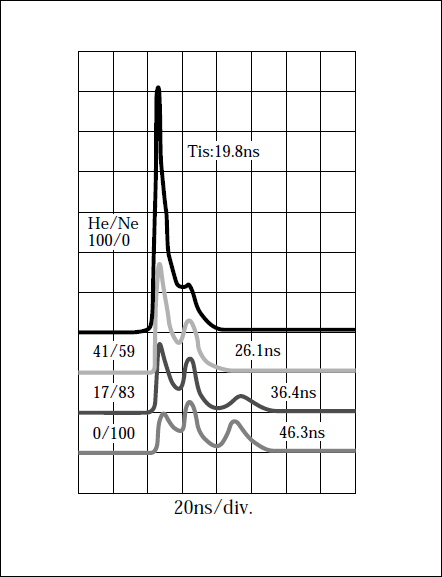 以上のように、高速電源を用いかつNeをバファガスに用いることにより、F2レーザのロングパルス化を図ることにした。図4は、バッファガスにHeを用いているが、高速電源(立ち上がり時間:70ns程度)と従来の電源を用いた場合のパルス波形を示す。高速電源を用いた場合のパルスが長くなっていることが判る。図5は、高速電源を用いた場合で、バッファガスとしてのNeの効果をみた実験結果である。Neの導入により、大幅にパルス幅が延びていることが判る。なお、図4および図5の結果は狭帯域化しない(フリーランニング)時のパルス波形である。なお、高速電源は、ArFエキシマレーザにおいてロングパルス化のみならず、高繰り返し化(>4kHz)も容易にした1)。このウシオ電機の高速電源技術は、現在、ギガフォトンに引き継がれ、優れた露光用エキシマレーザを実現している。