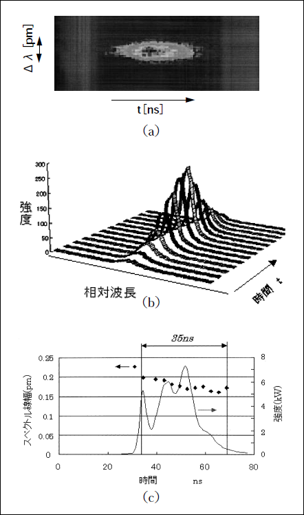 レーザパルス全体での線幅(積分線幅)は0.17pmで、目的とする0.2pm以下になっており、困難と思われた超狭帯域化を実現した。この線幅は自主開発した図7の分光器にて測定した。分光器の詳細を2.2で述べる。分光器の検出器(CCD)の所にストリークカメラと呼ばれる高速度カメラを用いて計測した結果を図6(a)に示す。図6(b)は、図6(a)から計算した、レーザ光強度、スペクトルおよび時間の3次元波形で、そこから、スペクトル線幅(半値全幅)を計算し、時間でプロットしたのが図6(c)である。図6(c)で注目すべきは0.2pm以下のスペクトル線幅になっている時間が35nsも長いと言うことで、これはこれまでに述べたロングパルス化の結果である。この0.2pm以下の時間が長いことが、3で後述するように、I/L成功の決め手の一つになった。