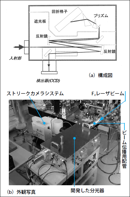 図7に開発した超狭線幅測定用分光器の構成(a)と外観写真(b)を示す。外観写真では、構成図における検出器CCDの代わりに、ストリークカメラを用いている。設計の詳細は省略するとして、ここでは、開発において特に重大な問題になった分光器内部迷光の対策につき記す。VUV領域では、高感度な検出器がないため、迷光によってS/Nが悪化する。そこで、迷光の主な発生場所と波長領域の特定およびセンサー自体のS/N向上を行うなどして迷光対策を試みた。その結果、センサー前へのアパーチャーの設置とセンサーの冷却がS/Nの向上に効果的であることが判り、同一入射光量で、迷光のみを対策前の1/100に減らすことができた。加えて、反射鏡表面における散乱で発生する光(157nm以外)の除去を目的に光学フィルターを装着し、迷光をさらに1/40~1/80に減少させることに成功した。