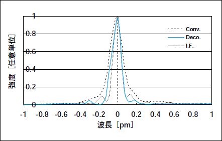 実測により、検出器であるCCDの1チャンネルあたり0.0165pmの分解能であり、開発した分光器は高分解能であると評価できる。ただし、分光器のプリズム、回折格子およびスリットなどの光学的特性から決まる関数である装置関数(IF: Instrument function)で、スペクトル線幅が広がって(太くなって)測定される。すなわち、実際に分光器で測定されるスペクトル形状は、入射した光のスペクトル形状にIFを掛け算(convolute)したものになり、スペクトル線幅は太くなって得られる。そこで、真の入射光のスペクトル形状はIFを除す(deconvolute)必要があり、IFを評価しておかなければならない。IFを知るためには、充分に細い光源を用いればよい。充分に細い光源を入射したときの分光器の出力はそのままIFと見なすことができるからである。本プロジェクトでは、IFの評価のため、スペクトル線幅が0.01pmと非常に細いコヒーレント光源を開発している2)。このコヒーレント光源を用いた超狭線幅測定用分光器のIFの評価結果が図8でIFと付したスペクトル形状である。IFの半値全幅は0.1pmとなっている。図8中のConv.と付したスペクトル形状はF2レーザを入射したときの分光器の出力である。図8のDeconv.がConv.とIFから計算したもので、F2レーザの本来のスペクトル形状となる。
