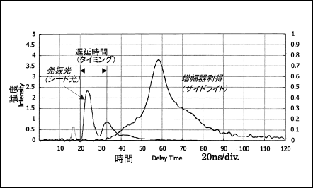 I/Lシステムにおいて、同期をとるということは、図14に示すように、発振器からのシード光を増幅器の動作(放電)開始時間を遅延させて導入するときに、その時間である遅延時間のタイミングを図るということである。なお、図14における増幅器利得(サイドライト)とは増幅器における放電光すなわち放電入力の波形である。
