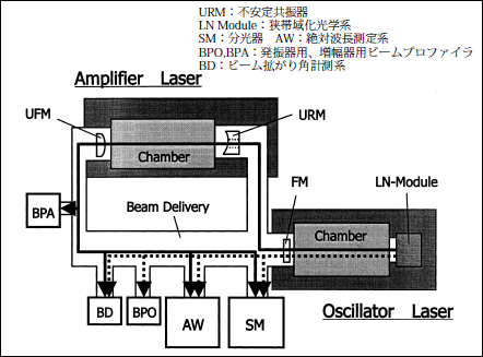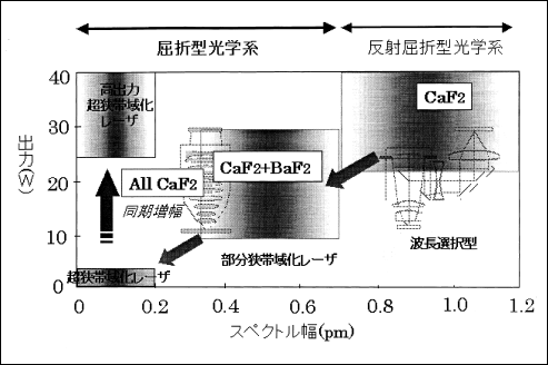 本開発の目標は、報告1の表1に示したように、スペクトル線幅0.2pm、繰り返し5kHz、出力5mJ/pulseの露光用超狭帯域・超高繰り返しF2レーザの実現であった。超狭帯域化F2レーザは図1に示すように(また、報告1の図2に示したように)、単一硝材CaF2屈折光学系用の光源である。