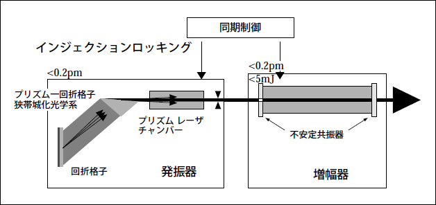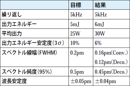 • ④Heバファガスを用いた発振器および増幅器とジッター補正回路などからなるI/Lシステムにおいて、0.2pm以下の超狭帯域化、5kHz以上の超高繰り返し化など全ての目標値を実現した。