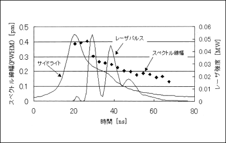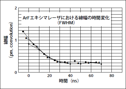 F2レーザの超狭帯域化のために、先ずは、発振持続時間の長時間化、すなわち、ロングパルス化を行った。図3はArFエキシマレーザにおける発振持続時間によるスペクトル線幅の変化で、パルスの持続と共に、スペクトル線幅が狭くなっていくことが判る1)。狭帯域化のためにはロングパルス化が必須である。