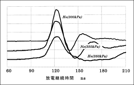超狭帯域化を目的としたロングパルス化を行うため、バッファガスとしてNeを用いたことを2.1で述べた。しかし、Neガスを用いた場合の高繰り返し化は容易ではない。一方で、バッファガスとしてHeを用いると、放電抵抗が大きくロングパルス化が難しいが、Neの場合に比べ、高繰り返し化が容易である。開発方針としてNeを用いて高繰り返し化を進めるということが、当然、一つの選択枝になる。しかし、Neを用いた理由、すなわち、放電抵抗が小さいからNeを用いたことを再考して、Heを用いても従来の4気圧程度のガス圧を低くすれば放電抵抗が減らされるのではないかと発想し、実験的に確かめた。