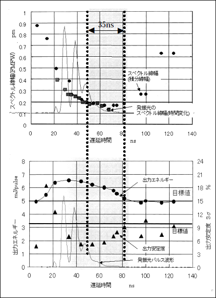 図15は、図10に示した発振器からのシード光を増幅器に導入した場合の、5kHzの超高繰り返し動作におけるスペクトル線幅、出力エネルギーおよび出力安定度の遅延時間特性である。35ns以上という長い遅延時間幅に亘って、スペクトル線幅、出力エネルギーおよび出力の安定度が、同時に、各の目標値である0.2pm以下、5mJ以上および10%以下になっていることが判る。以下では、目標値が得られる遅延時間幅をジッター許容時間と呼ぶことにする。図15から、このジッター許容時間が~35nsと長いことが判る。このことから、ジッターがあったとしても、±17.5ns以下に抑えることができれば、遅延時間をジッター許容時間の真ん中(図15では約47ns)に設定することにより、スペクトル線幅などの目標値が安定に得られることになる。長いジッター許容時間が得られたのは、2.1で述べたように、ロングパルス化に成功したからである。