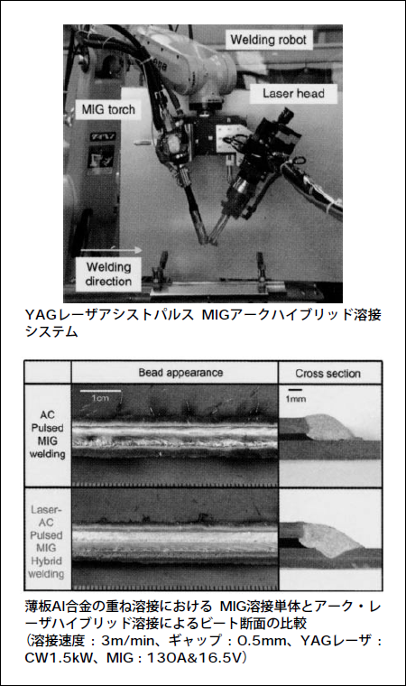また、溶接においては複合化ということが一つのキーポイントだと考えています。それぞれの技術がある程度に達したら、今度はお互いを補完するハイブリッドという考え方をうまく活用する必要があります。例えば、レーザとアークを使った溶接方法です。レーザ溶接は、光学的にビームを絞ってパワー密度を強くして基盤の金属を蒸発させ、穴を開けていきます。そこを溶けた金属で埋めていくというやり方です。この方法は速度が非常に速いのですが、この方法だけでは底まで溶けた金属が到達せず、空洞がたくさんできてしまいます。そこでアークを組み合わせるのです。アークだけでは溶接速度が遅い。この二つを組み合わせることにより、中間的な速度で、欠陥のない溶接が可能になるのです。