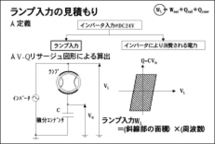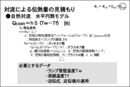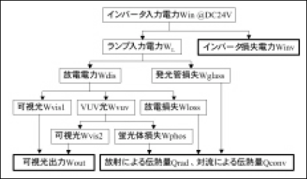 W inはインバータ入力電力、W invはインバータ損失の電力を表す。これらの電力算出はV-Qリサージュ図形により求めた。W outは光源として利用する可視光の出力であり、全光束Φ、ルーメン当量LEを測定し、算出する。Q rad+Q convは発光管損失や放電損失、蛍光体損失にともなう伝熱量であり、ここでQ radは表面から放射される伝熱量、Q convは対流による伝熱量である。Q radはランプ管壁温度の実測により算出し、Q convは水平におかれた円柱の自然対流を仮定して見積もった。