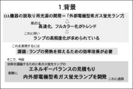 現在、OA機器の読取り用光源として希ガス蛍光ランプが使用されているが、高照度化にともないランプからの発熱が問題となり、効率改善が求められている。今回、発光管の外面と内面に一対の電極をもった内外部電極型希ガス蛍光ランプの検討を行い、当該ランプの効率を算出するために、エネルギーバランスの見積もりを行ったので報告する。