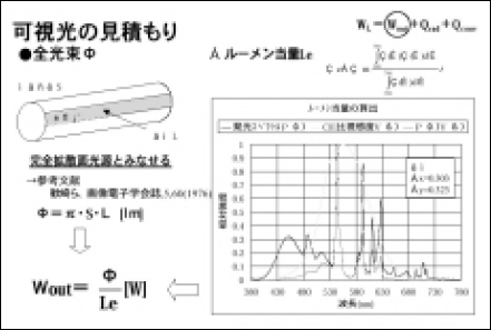 外径Φ8mm、三波長混合タイプの蛍光体を用いた内外部電極型希ガス蛍光ランプにおいて、フライバックインバータで点灯させた時のエネルギーバランスの見積もり概算を行った。その結果W in が16.8Wの時、W Lが11.7W、W outが0.6W(全光束180lm、ルーメン当量280lm/W)、Q radが5.5W、Q convが8.4Wであった。この見積もりから、利用している可視光の出力はランプ入力WLの約5%程度であることがわかった。また見積もりの精度を上げるために、電力の測定方法、伝熱量の見積もり方法等を改善することが今後の課題である。