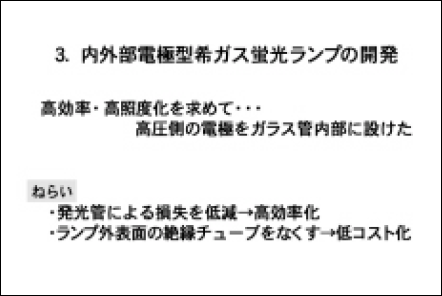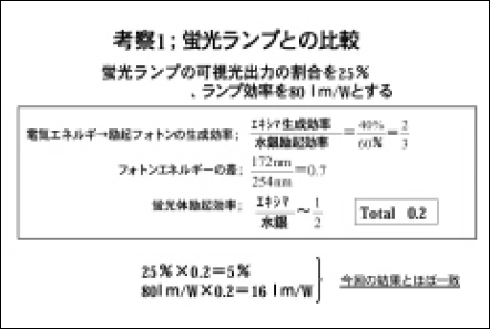 一方、発光管外部に一対の電極を設けた従来型ランプとの比較を行った結果、照度において内外部電極型の優位性は10%程度であった。