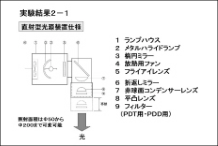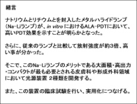 【目的】ナトリウムとリチウムとを封入したメタルハライドランプ(Na-Liランプ)が、in vitroにおける5-ALAを用いたPDTにおいて、高いPDT効果を示すことが明らかとなった。そこで、Na-Liランプを用いてファイバー型および直接型装置を作製し、それぞれの装置の日光角化症、疣贅および尋常性ざ瘡に対する有用性の確認を行った。