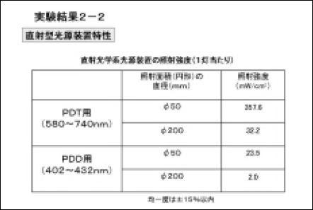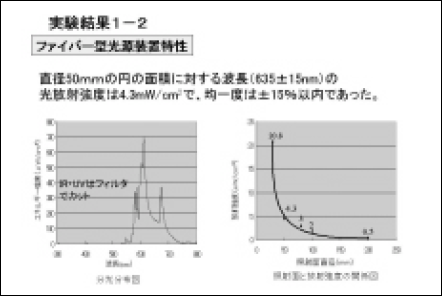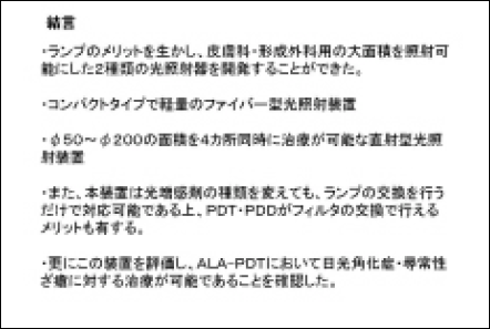 【結果】ファイバー型装置は、電力150Wで、幅180mmx奥行289mmx高さ161mm、重量4.3kgである。さらに、照射面積19.6cm2(直径50mmの円)における波長635±15nmの光の放射強度は4.3mW/cm2で、均一度は±15%以内であった。直射型装置は、照射面積19.6および314cm2(直径50mmおよび200mmの円)おける波長580~720nmの光の放射強度は、それぞれ357および32mW/cm2であった。ファイバー型装置を用いた日光角化症の臨床では、1~5回の施行で1週後に、皮疹では1~6週で消失し、疣贅に対しては2回の照射で治癒した。また、直射型装置を用いた尋常性ざ瘡の臨床においては、十分な治療効果が認められた。