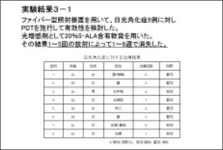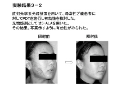 【方法】ファイバー型装置では、放射光を楕円ミラーを用いてプラスチック系ファイバー(直径:約10mm)に導入し、ファイバー照射端部に投影レンズを取り付け照射光を均一化した。直射型装置は、照射エネルギーの低下を防止するためケーラー照明法を採用し、照射面積を連続的に変化できるように可動型対物レンズを用いた。いずれの装置もNa-Liランプを用いて、600~700nm用フィルターと熱線カットフィルターとを装着した。ファイバー型装置を用いて、光感作物質として20%5-ALA含有軟膏を用い、日光角化症8例および疣贅1例に対してPDTを施行した。また、直射型装置を用いて、尋常性ざ瘡約300例に対してPDTを施行した。