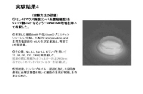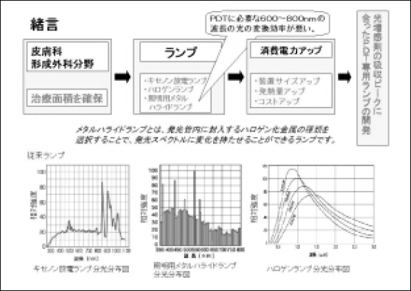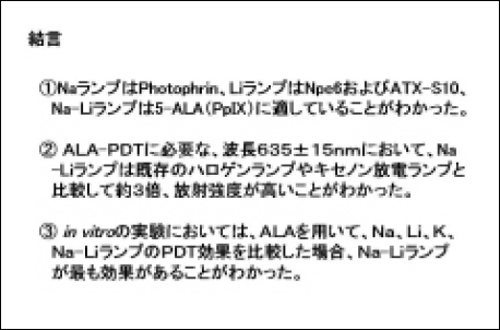 【結果】各メタルハライドランプの放射スペクトルと各光増感剤の吸収スペクトルとを比較したところ、NaランプはPhotophrin、LiランプはPheophorbide、Npe6およびATX-S10、Na-Liランプは5-ALA(PpIX)に有効であることが分かった。また、キセノン放電ランプ、ハロゲンランプおよびNa-Liランプを用いて、635±15nmの放射強度を求めたところ、それぞれ1.9、2.2および6.4Wであり、Na-Liランプはキセノン放電ランプおよびハロゲンランプよりも約3倍高い放射強度を持つことが明らかとなった。さらに、光増感剤として5-ALAを用いてPDT効果を検討したところ、Na-Liランプが最も有効である事が分かった。