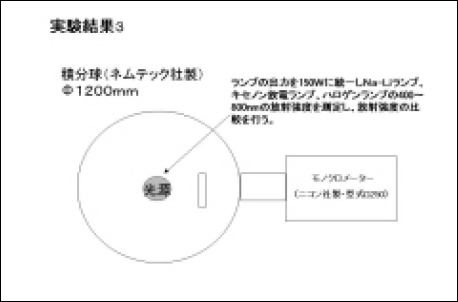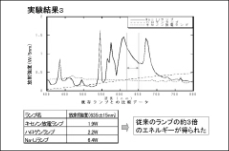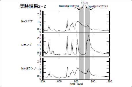 【方法】種々の金属ハロゲン化物を封入したメタルハライドランプ(Na、Li、K、RbおよびNa-Liランプ)を作製し、放射スペクトルを測定した。さらに、これらのランプと、キセノン放電ランプおよびハロゲンランプ(いずれも150W)との照射スペクトルを比較した。また、in vitroにおけるEL-4に対するPDT効果の確認を行った。