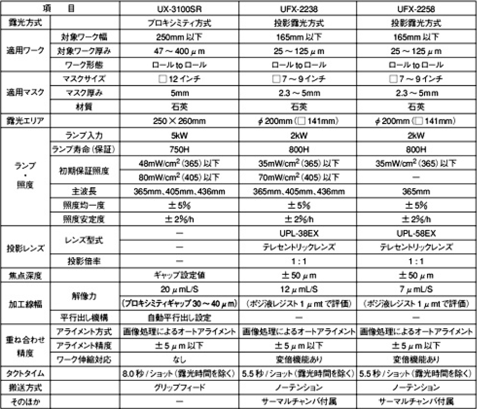 テープ幅165mm対応のロールtoロール露光装置で,露光方式は投影倍率1:1のテレセントリックレンズによる投影露光である.アライメント方式は,画像処理によるオートアライメントとなっている.