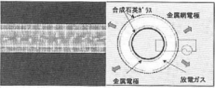 図1に誘電体バリア放電ランプの一例の概略図とXe2*ランプの放電の様子を示す。管径の大きな外側管の中に内側管を同軸に配置し,両端を閉じて中空円筒状の放電空間を形成する。電極は内側管の内面と外側管の外面配置される。外側管および内側管は石英ガラス製で,外側電極である金属網を通してエキシマ光が放射される4)