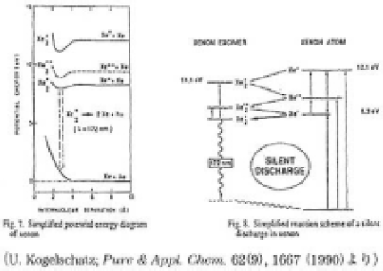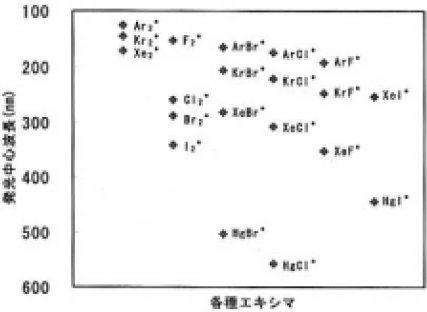 前述で“新しい”ランプと述べたが,これは,従来の放電ランプにおいては原子スペクトル,分子スペクトルあるいは再結合放射の何れかを利用しているのに対して, エキシマランプではエキシマ(Excimere,励起状態にある多原子分子の総称)の発光を利用している。