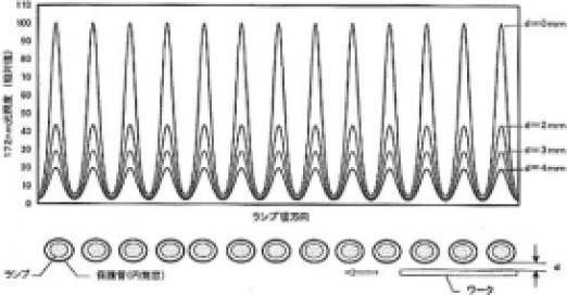 一方,ランプを円筒保護管(円筒状窓)内に配置する方式もある。この方式では,172nm光の場合,大気中の酸素による吸収が大きいため,平面窓方式に比べ光の利用効率が低くなる。ランプピッチ28mmのランプハウスにおける172nm光放射照度分布の計算結果を図9に示す。図より分かるように,ランプ間では酸素の吸収のため光照射が少なくなる。