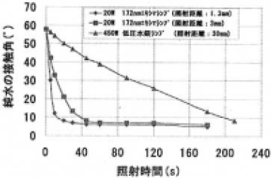 各種基板の光洗浄前後の接触角変化を図12に示す。洗浄は一括照射平面窓方式の照射装置を用いて行った。窓面における172nm光放射照度は12mW/cm2,照射距離は3mm,照射時間は大気中で10secである。