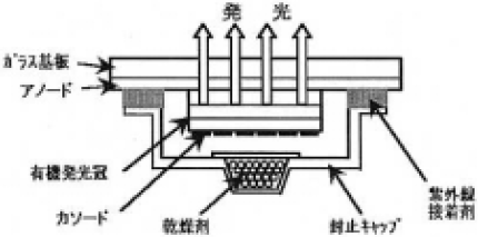 現在主に使われている有機ELディスプレイは発光層に低分子有機材料を使用したものである。低分子有機材料は,極めて水分に弱く,大気に曝すと湿気を吸い込み,輝度が低下してしまう。そのため,大気を遮断した雰囲気で金属やガラス製の封止用キャップを紫外線硬化型接着剤で封止(カプセル化)して,大気と完全に遮断させる。有機ELの概略構造を図14に示す。