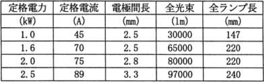 表に定格入力電力1kW~2.5kWのランプの特性例を示す。