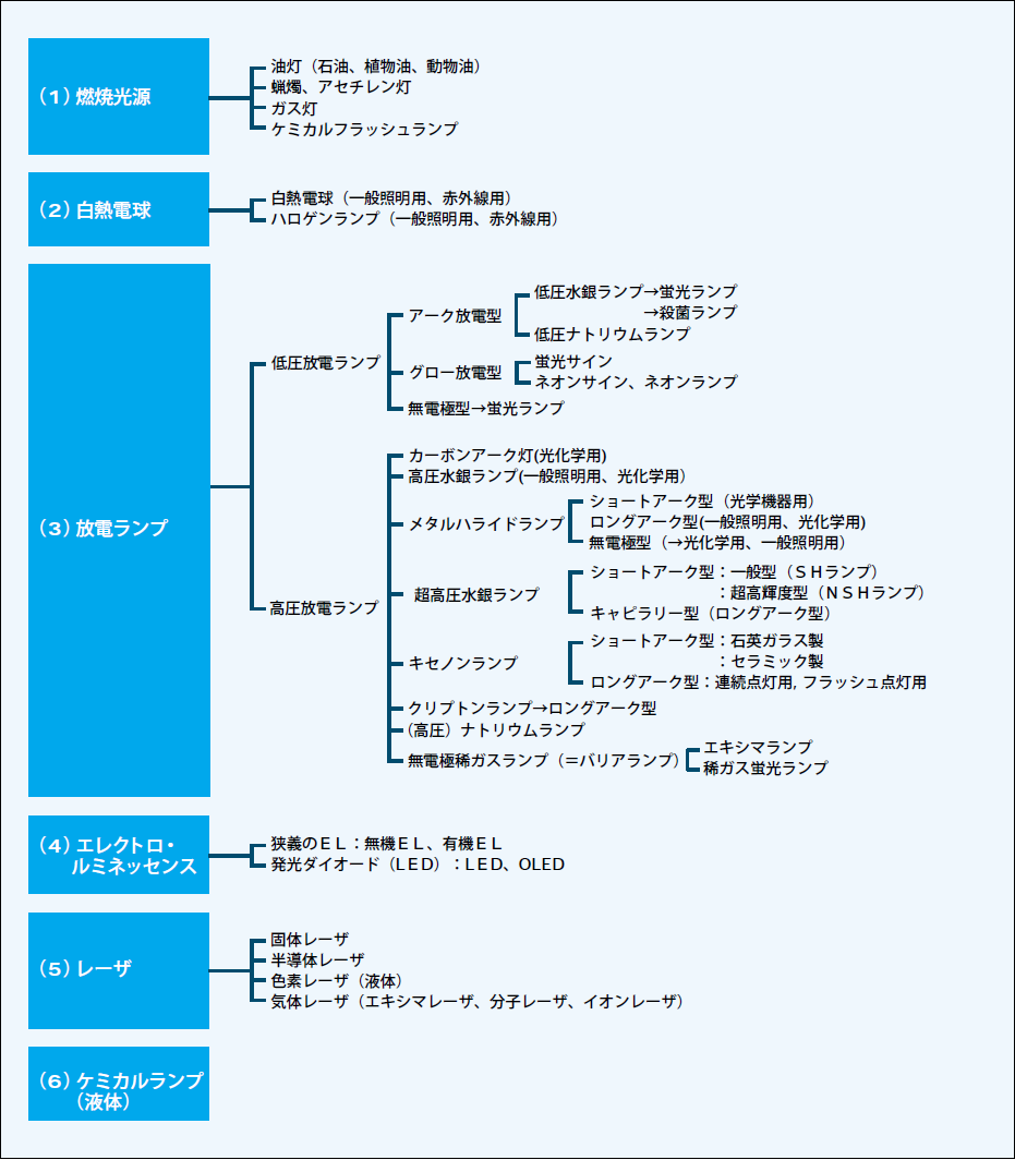 図2-1に人工光源のおおまかな分類を示す。燃焼光源は、電気エネルギーを使用した白熱ランプや放電ランプが出現する以前に重用された光源であるが、発光原理的には燃焼熱により炭素粒子(油灯、蝋燭)やセラミック(ガス灯)、ジルコニア粒子(ケミカルフラッシュランプ)が加熱され、白熱発光する現象を使用したものである。油灯はエジプトや中国では約5000年前から実用されていたが(恐らく動物油灯)、現在では油灯(植物油、灯油)や蝋燭は寺院、山小屋などで使用されているだけである。ガス灯も現在では記念品的な使用例が幾つかあるだけである。