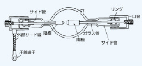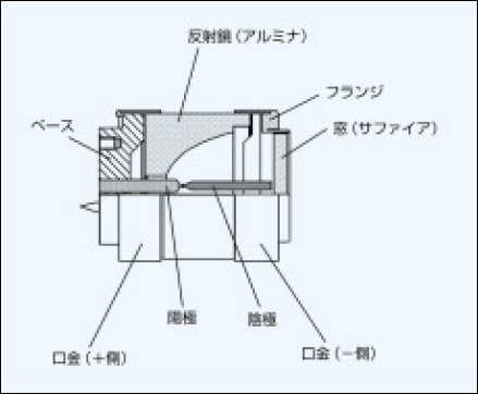図4-8に示すように陰極先端部分の輝度が一番 高く、陰極輝点と呼ばれ、普通数千万cd/m2のものまで作られており太陽の輝度(2.07x199cdm2)を超えるような設計のランプもできる。