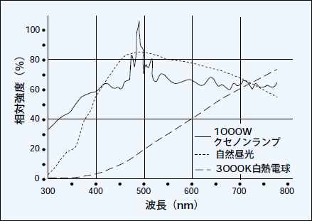 キセノンランプのスペクトルが自然光に近いことをそのまま利用したものである。300W~30kWまで、幅広いパワーのキセノンランプが使用されている。