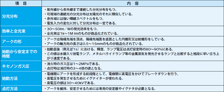 キセノンショートアークランプは上述した特長によって表4-2のような用途にまとめられ、重視される特長には◯印がつけられている。