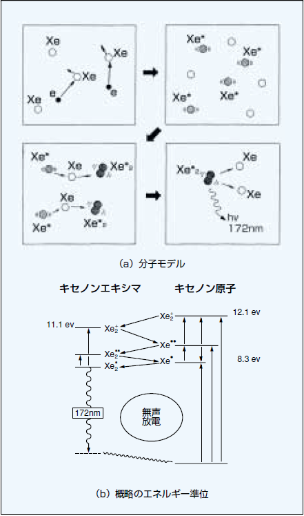放電空間中のXe原子は、放電プラズマ中の電子(e)により励起(Xe*、Xe**)或いは電離(Xe+)される。更にこれらとXe原子との様々の衝突過程を経て、エキシマ発光の基となるXe2*が生成される。Xe2*の寿命はn秒程度と大変短く、直ちにエネルギーの低い状態に戻り、解離して最終的に安定な状態(基底状態)のXe原子に戻る。この時開放されるエネルギー(E)が、光(エキシマ光;ν=E/h)として放射される。
