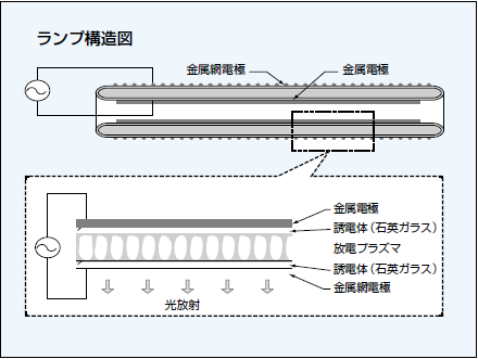 図4-83は円筒外部放射型のエキシマランプ(構造は後述)と誘電体バリア放電の概略を示したものである。2つの誘電体(石英ガラス)で空間を形成し、この空間に放電用ガスが充填される。2つの誘電体の外側(放電空間で無い側)に電極が配置され、電極間に高周波、高電圧が印加される。この電圧が放電破壊電圧に達すると、放電空間に放電が発生する。しかし、放電路に直列に誘電体が存在するために、誘電体表面に電荷が蓄積されると次の逆電圧が印加されるまで放電は終止してしまう(誘電体のバリア効果)。放電の寿命は数10n秒程度である。この放電プラズマがエキシマ生成の励起源として利用される。