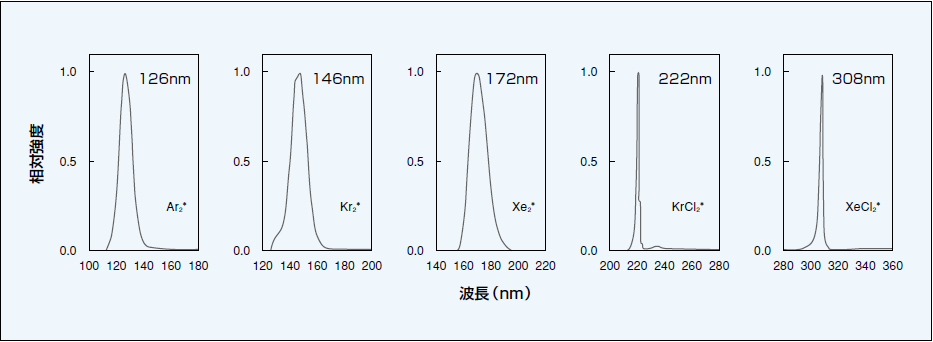 放電用ガスとして希ガス或いは希ガスとハロゲンガスの混合ガスを用いると、図4-84に示す各種エキシマ光の発光中心波長に見られるように、ガス種により色々な波長のエキシマ光を発光させることが可能である5)。ここで現在ランプとして商品化されているものとしては、希ガスXe、Kr、Arを用いた発光中心波長がそれぞれ、172nm、146nm、126nmのもの、希ガスKr、Xeと塩素(Cl)の混合ガスを用いた発光中心波長がそれぞれ、222nm、308nmの5種がある。各エキシマランプの分光スペクトルを図4-85に示す。Ar2*、Kr2*、Xe2*、KrCl*、XeCl*それぞれの発光スペクトルの半値全幅(FWHM)は、10nm、13nm、14nm、2nm、2nmであり、発光スペクトルは実用的に単一波長と考えられる。