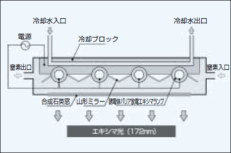 誘電体バリア放電ランプは、従来の放電ランプと違い1本のランプにおいて放電面積を増加させるのが容易であること、更に1個の電源で複数本のランプを並列点灯することが可能なので、ランプを複数本並べることにより、容易に高出力、大面積化を達成することができる。図4-87にXe2*ランプを4本並列に並べた平面窓方式で、ランプ間接水冷方式のランプハウスの概略を示す8)。この構造では、金属ブロックを介して間接的にランプが冷却される。またランプとランプの間には山形のミラーが設けてあり、光を有効に取り出すと同時に窓面の放射照度分布を均一にする働きをしている。ランプ、金属ブロック、山形ミラーが収められているランプハウス内は、酸素による真空紫外線の吸収を抑えるために窒素ガスで満たされている。窒素ガスは172nm光を吸収しないため、光を有効に取り出すことができ、また、真空紫外線の吸収により生成した活性酸素によるランプ電極、ミラーの酸化を防止している。ランプ前面には効率良く光を透過する窓ガラス(合成石英ガラス)が設けてあり、窓ガラスよりエキシマ光が照射される。図4-88には現在市販されている平面窓方式のエキシマ光照射装置の写真を示す。