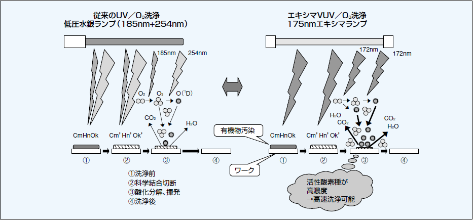 UV/O3洗浄法は、紫外線(UV)と活性酸素種であるオゾン(O3)とを組み合わせた光洗浄法で、精密なドライ洗浄法として広く利用されている。従来は185nm光と254nm光を放射する低圧水銀ランプが用いられて来たが、近年、前述のXeガスを封入した誘電体バリア放電エキシマランプがその特徴を生かし、低圧水銀ランプに置き換わってLCD製造工程のウェット処理や成膜工程等の前洗浄に広く使用され、主流となっている。このUV/O3洗浄の概念を低圧水銀ランプとXe2*エキシマランプを比較して図4-90に示す。