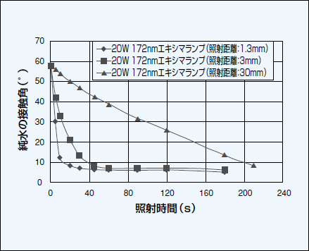 基板表面の有機汚染に対する評価法としては、最表面分析法である光電子分光分析法(XPS)や、昇温脱離ガス分析法(TDS)などがあるが、これらはいずれも評価に時間がかかることや、分析装置が高価なことなどにより、一般には表面の濡れ性を評価する接触角法が簡易な方法として用いられている。清浄度を示す尺度は純水の接触角度で表され、5度以下が一般の目安となっている。図4-91により低圧水銀ランプに比べて172nmエキシマランプによる洗浄速度は数倍速いことが理解される。