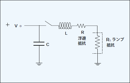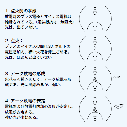 絶縁破壊が発生し、細い放電路が形成されたら、それをグロー放電を通ってアーク放電にスムーズに移行させなければならない。このために、点灯装置から突入電流が供給される。突入電流は、点灯装置内部の100V~200Vに充電されたコンデンサに蓄えられた電荷を一気に放出することにより発生させている。