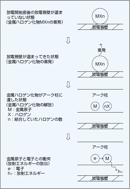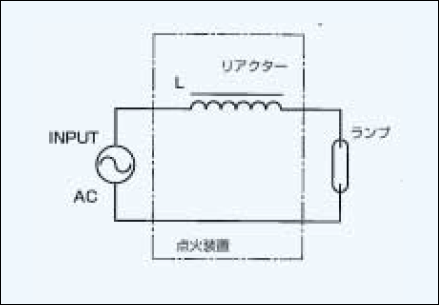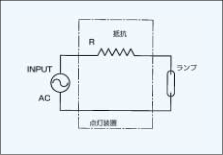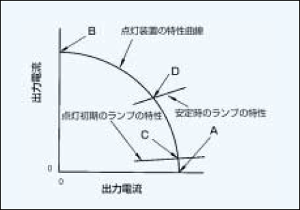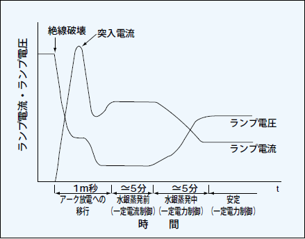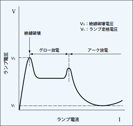 アーク放電に移行すると、ランプ電圧は急激に下がる。安定なアーク放電に移行する過程において、ランプ電流が増えるとランプ電圧が下がる、負特性と称される領域がそれである。点灯装置は、ランプ電流を限流することにより、放電を安定に維持させる役割を果たす。