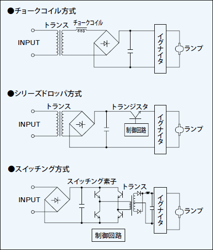 点灯装置の回路方式は、図4-13に示すような下記の種類がある。