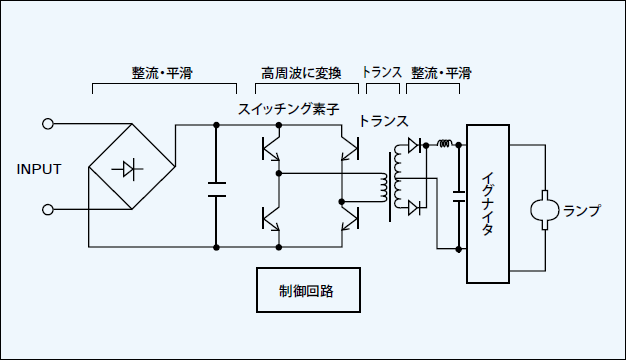 一方、短期間であっても点灯装置の出力電流がランプのアーク放電保持電流を下回ると、アーク放電を保持できなくなり、ランプは立ち消えに至ってしまう。このため、突入電流を低く抑え、アーク保持電流以上を維持し、なおかつ1回の点灯動作で確実に点灯することが、点灯装置の大きな役割である。