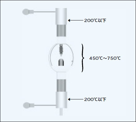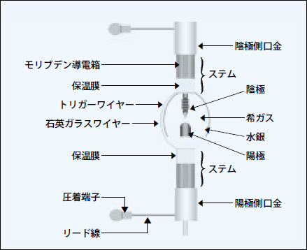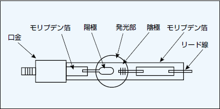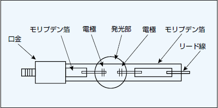 電極にモリブデン箔を溶接し、その箔を発光管の石英ガラスで封着し、膨張係数の差による応力をモリブデン箔の塑性変形で緩和し、気密を保ったもの。